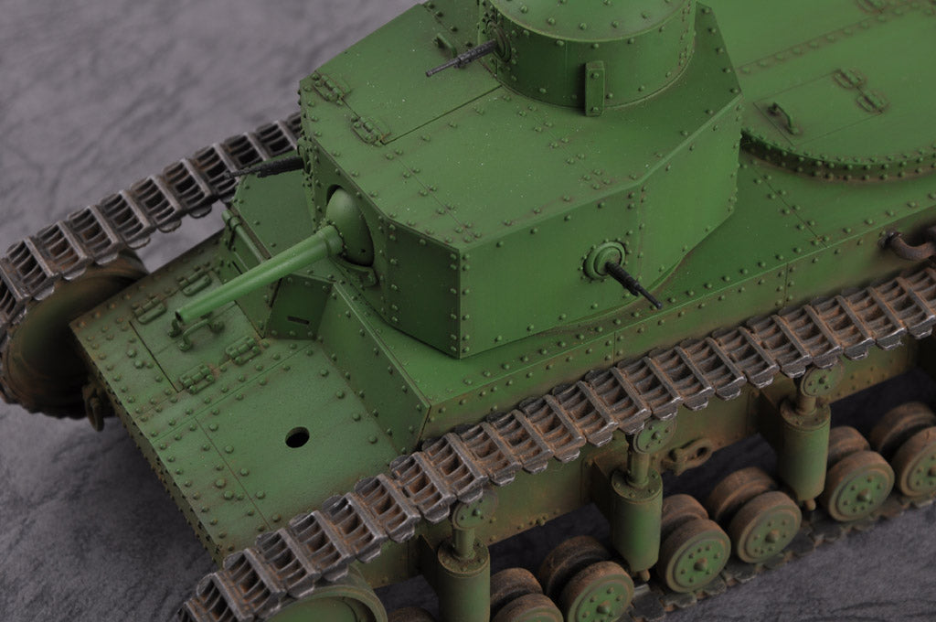 It had a eight-sided turret with a rounded commander’s cupola and a crew of four. It weighed 19 tons, was 7.5m long, 3m wide, and 2.8m high. It was armed with a typical Model 32 45mm gun, with space for 1000 rounds, and it even had three 7.62mm DT machine guns in a Fedorov-Ivanov ball mount – one in the commander’s cupola, one next to the main gun, and one on the side of the tank’s turret. Like all Soviet tanks of that time, the T-12 had a removable “tail”, which increases the length of the hull 690mm, and gave the opportunity to overcome the trenches up to a width of 2.65 meters.