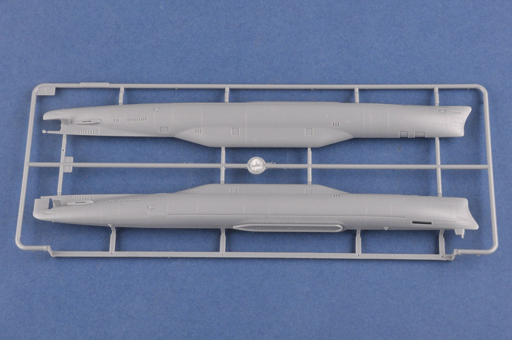 Chinese-built to Russian plans, this submarine was originally fitted for three Russian SLBMs. Because the first-generation Chinese SLBMs (JL-1) were larger in diameter than the Soviet missiles, it only has two launch silos in the sail.