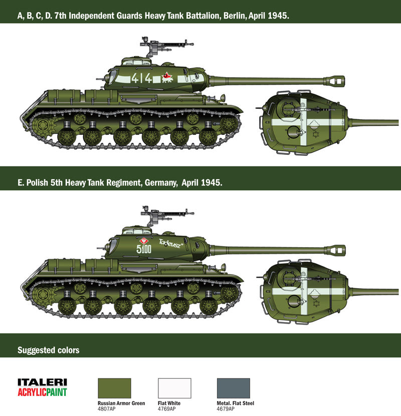 In February of 1943, to replace the outdated KV series, the first prototypes of the new heavy tanks has been designed with the specific purpose to equip the Red Army tank regiments and counterbalance the new and effective German Tiger and Panther. The most famous was the Joseph Stalin JS-2. It adopted, as main armament, the powerful D25-T mm gun, installed in the central turret and it has been characterized by the casted hull, the heavy armor and the use of the 12 cylinders diesel 600 HP engine. The total weight of the JS-2 was 46 tons. It was used in the battles that brought to the liberation of Ukraine, in the operations to conquer Hungary and in the final stage of the World War II in Europe : the Battle of Berlin.