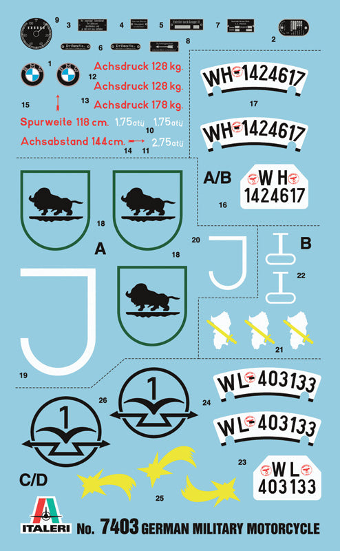 In 1938, based on a specific request of the German army, BMW and Zundapp received the brief to start a co-joint development project able to guarantee the highest number of common components to optimize the maintenance activities and the spare parts logistic. The prototypes had been released on 1940 and the production started at the beginning of 1941. Its peculiar feature was to have the side-car wheel that was driven with an axle connected to the rear wheel of the motorcycle. These were fitted with a locking differential and selectable gear ratios to optimize the on-road / off-road performance. The twin-cylinder engine with a displacement of 750 cc was capable of delivering 26 HP. The BMW R75 was able to reach the max speed of 95 Km/h. It was widely used, proving its realiability and sturdiness, on all most important operating theaters and in all environmental conditions (from North Africa to Russia).