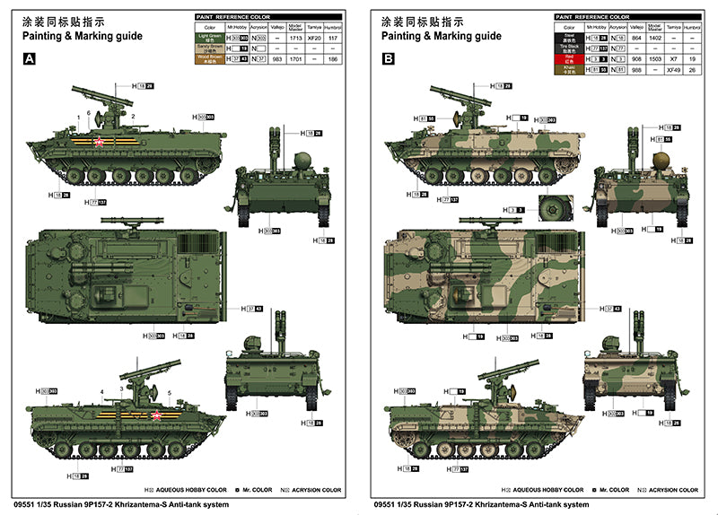 9P157-2 "Khrizantema-S" - Anti-tank version with Khrizantema (AT-15) system with radar and laser guidance. The 9P157-2 carries two 9M123 missiles on launch rails which are extended from a stowed position, the radar is also stowed during transit. The missiles are re-loaded automatically by the tank destroyer from an internal magazine with 15 rounds (missiles are stored and transported in sealed canisters) and can also accept munitions manually loaded from outside the vehicle. The manufacturer claims that three 9P157-2 tank destroyers are able to engage 14 attacking tanks and destroy at least sixty percent of the attacking force. The dual guidance system ensures protection against electronic countermeasures and operation in all climatic conditions, day or night. The 9M123 missile itself is supersonic, flying at an average speed of 400 m/s or Mach 1.2 and a range of between 400 and 6000 meters.