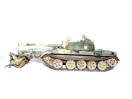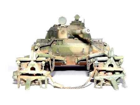 《Finnish Army T-55 w/kmt-5》In the early 1960’s, the KMT-5 system was introduced. This uses a lighter-weight mine trawl in conjunction with the KMT-5mine rakes. The chain stretched between the two roller sections has a “dog-bone” attached in the center which is intended to detonate any tilt-mines which might otherwise slip through the center of the trawl and detonate under the tank’s belly.