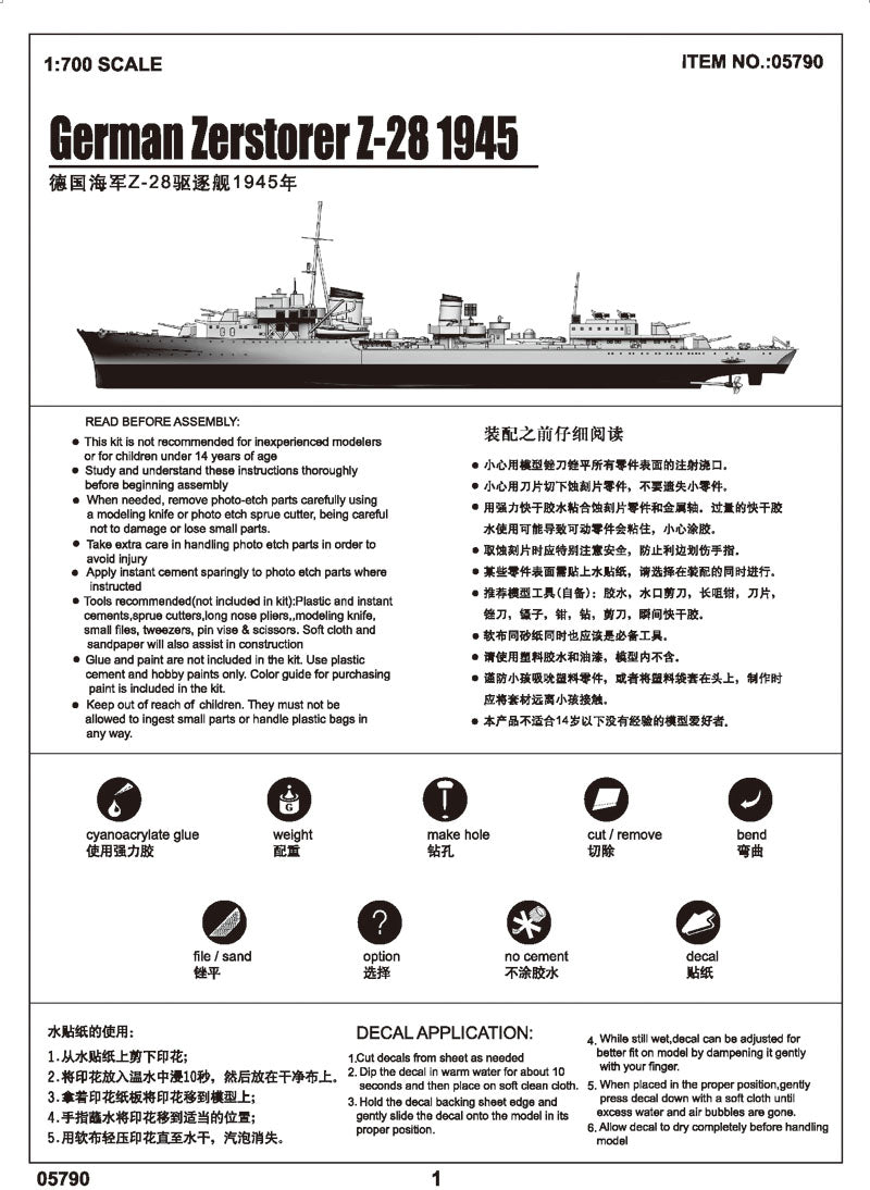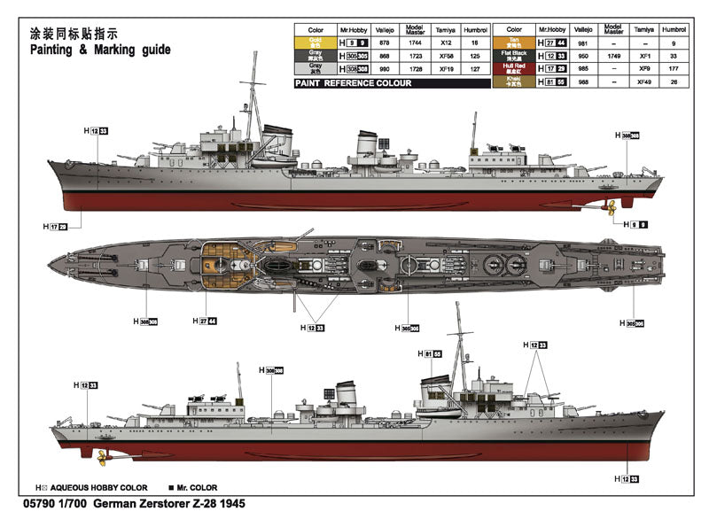Z-28, a Type 1936A destroyer, was commissioned on August 9th, 1941. Z-28 was different from all of the others. Designed from the outset as a flotilla leader, Z-28 mounted four single 15cm guns. This was the only ship among Type 1936A destroters mounting a main gun in the B position. The aft deck house was much larger with expanded accommodations for the staffs Z-28 was sunk by British bombers on March 3rd, 1945 in Baltic Sea.
