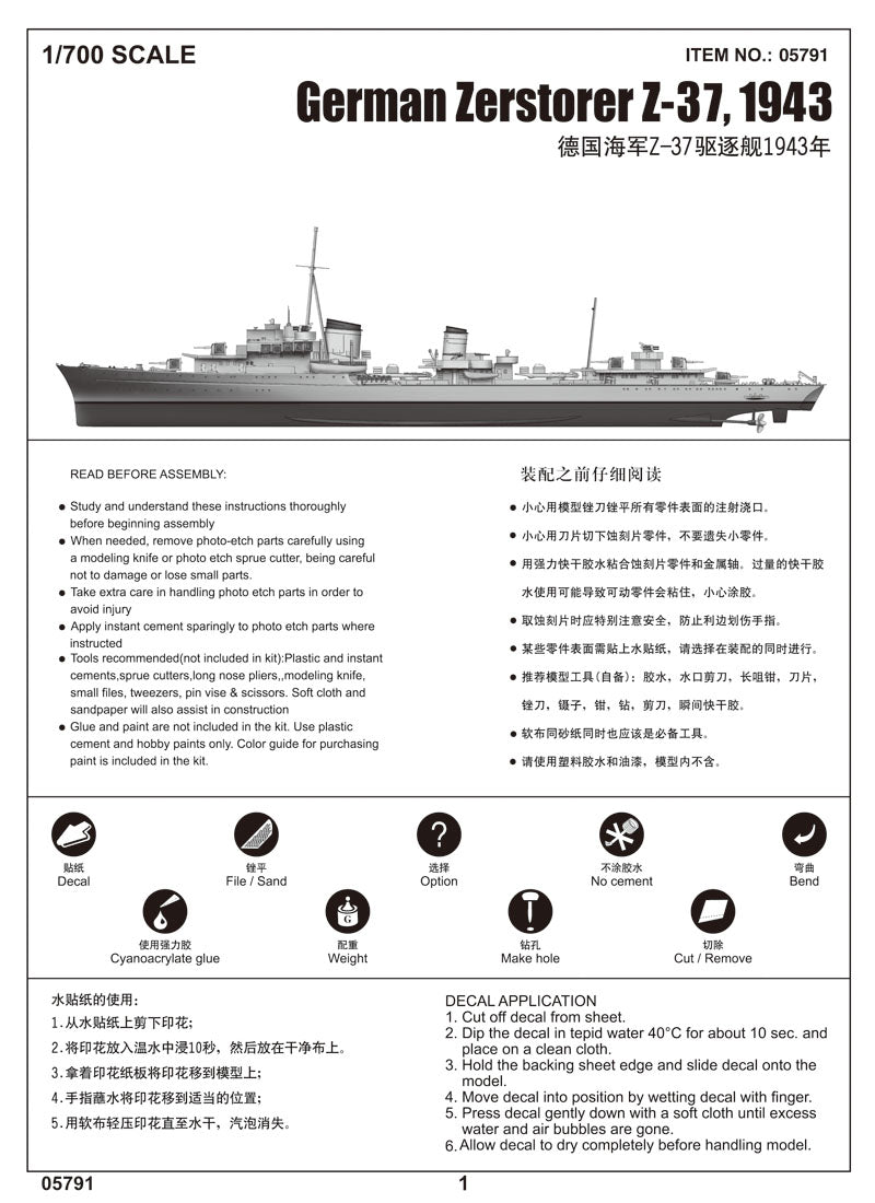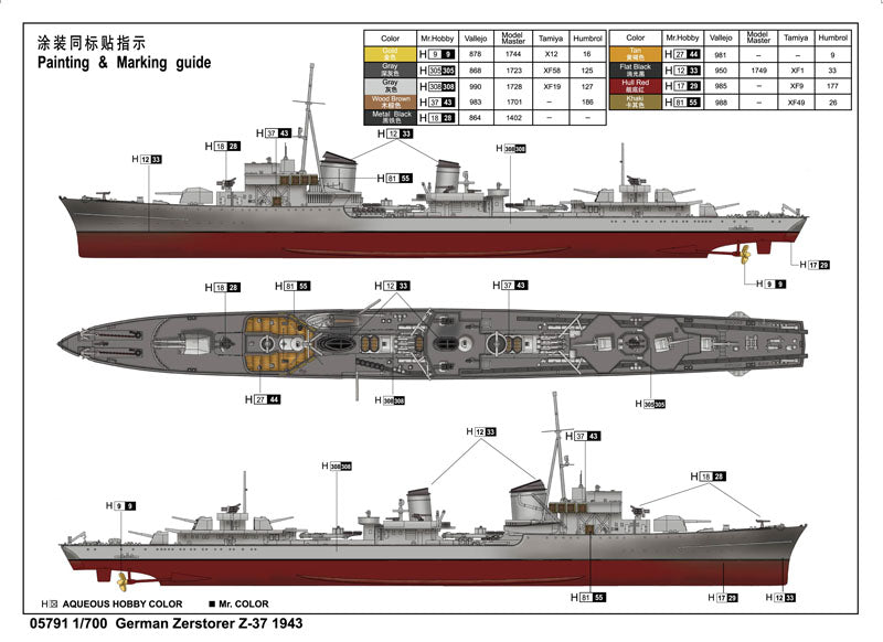 Z-37 belonging to the 1936A the MOB type, Displacement: 3691 tons ,Length: 127 meters, wide: 12.0 m, draft: 4.62 m, 332. Container: 150mmL/48 C/36 gun 5 37mmL/83 C/30 guns 4, 6 20mmMG L/65 C/30 guns, 533mm torpedo 8, 60 mines, depth charges and four transmitter . Construction of a total of 7, respectively, Z-31, Z-32, Z-33 ,Z-34, Z-37 ,Z-38, Z-39. Basically the same equipment and the 1936A-type appearance, the main difference lies in the increased chimney cap after the bridge, the bridge after the crane to move to starboard on the bridge, the radar below the appearance subject to change, as well as the location bow anti Langban, rely on before.
