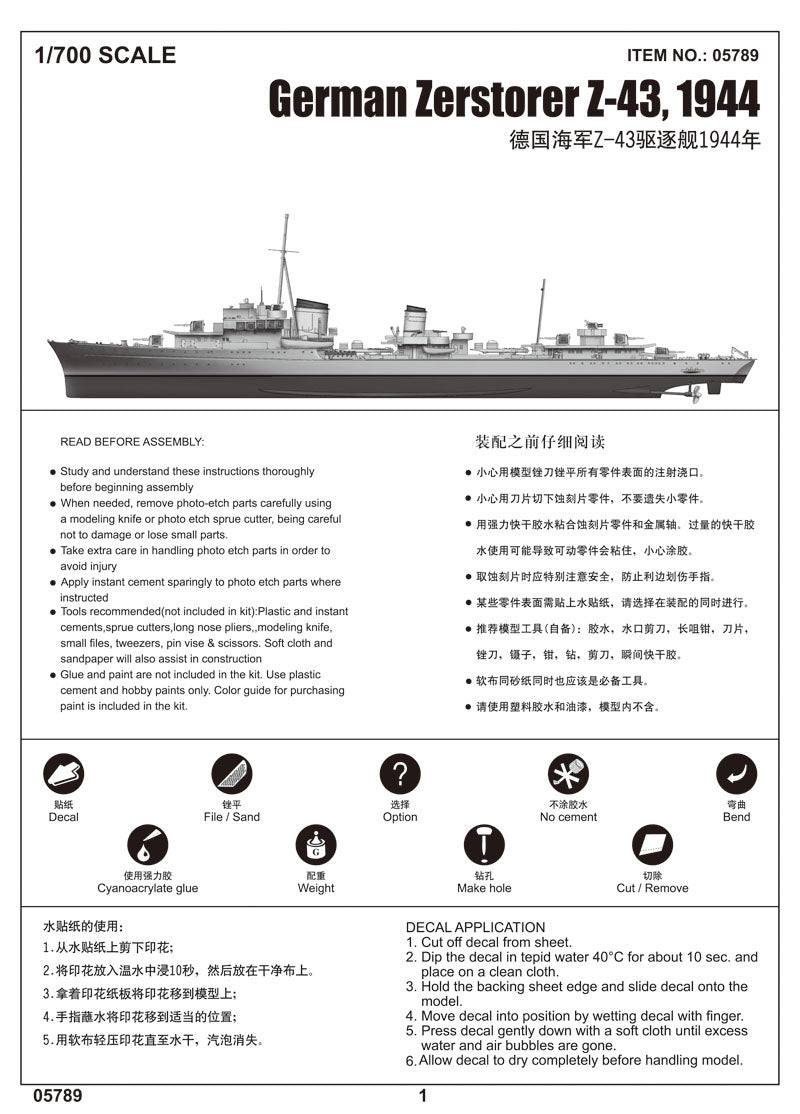 Z-43 was commissioned on March 24th, 1944. She was a Type 1936B destroyer. Three ships of this class were commissioned. The rest two were never completed. Type 1936A destroyers were intended to carry their forward guns in a twin turret, but as the twin turrets were not ready in time they initially carried single mounted guns. When the turrets were finally fitted they proved too heavy for the existing structures. Strengthening was added at the bows but this did little to improve seakeeping qualities. For these reasons, the main armament of Type 1936B destroyers reduced back to single mounted 127 mm guns. The efficacy of this change was not proven in high seas as this class only operated in the Baltic and coastal waters.