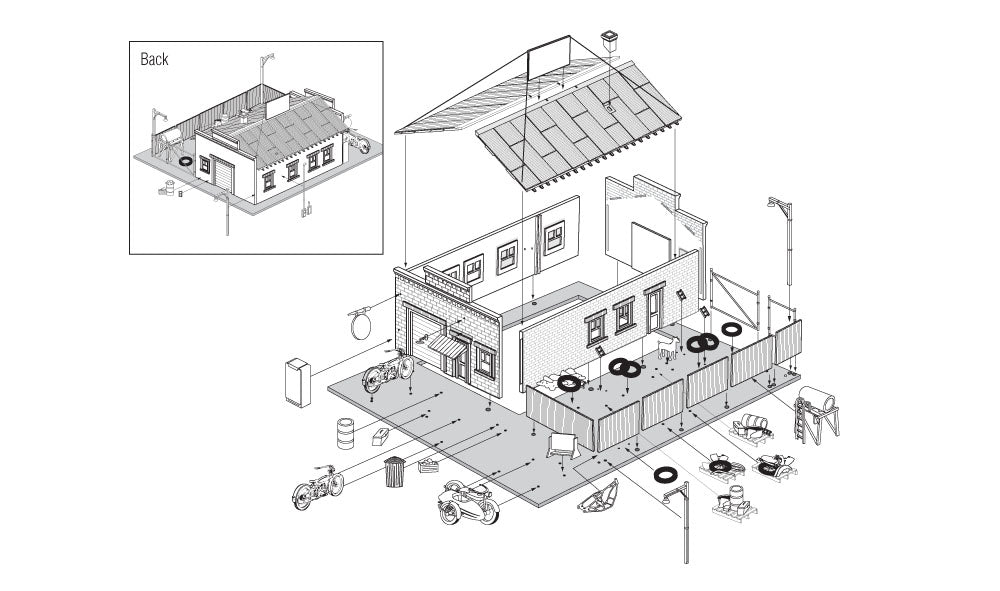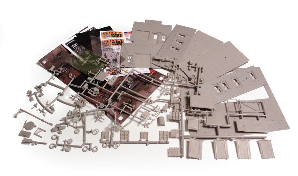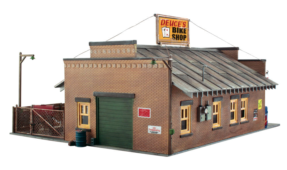 Spice up the 'seedy' side of your town with a dash of historical flare. Deuce's Bike Shop represents a nostalgic 'easy rider' setting with incredible detail. Accessories include signs, an old pop machine and a fenced yard with a junkyard dog, old bike parts, miscellaneous junk and more!