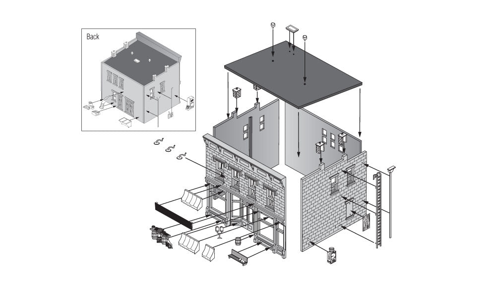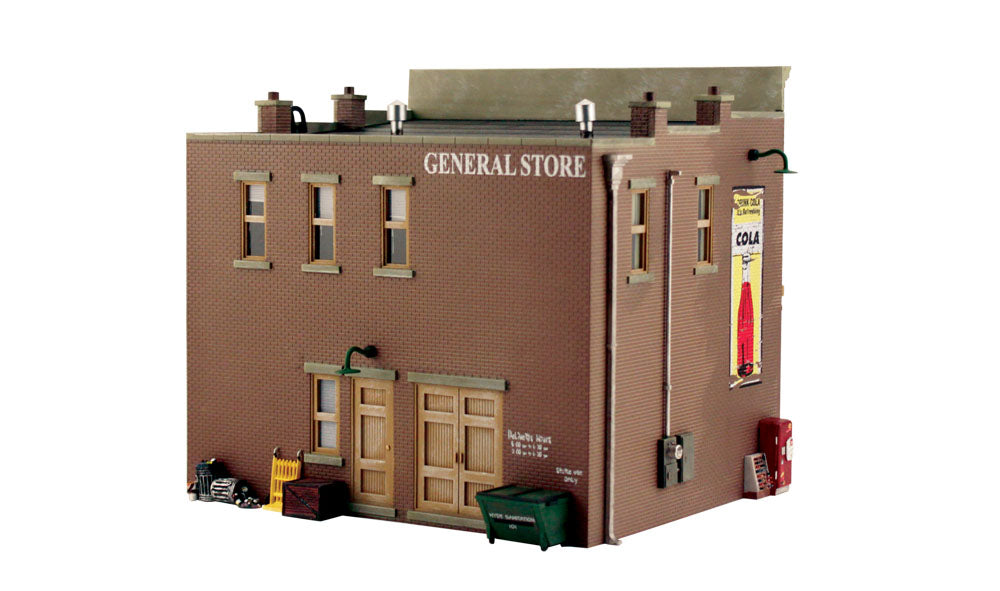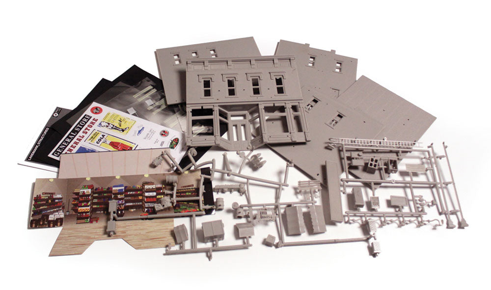 Every layout needs a general store - the social hub of early-day, rural America. Lubener's General Store is where town residents can play checkers and chat, while others shop for groceries, household items and sundries. Includes accessories, such as awnings, bubblegum dispensers, signs, old cola machine, barrels, light fixtures and more!