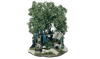 Whether he needed it or not, he always gets his bath. Includes a wooden fence, the clothesline, clothes, a well house, four trees, foliage, the base and assorted pieces. This scene is designed to fit in our Glass Display Dome and Base (M127).