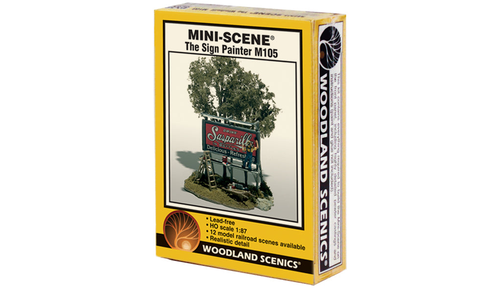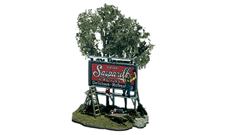 The man on the scaffolding paints the Sarsaparilla sign. Includes the sign, ladder, scaffolding with paint buckets, a cart, two trees, foliage, the base and assorted pieces. This scene is designed to fit in our Glass Display Dome and Base (M127).